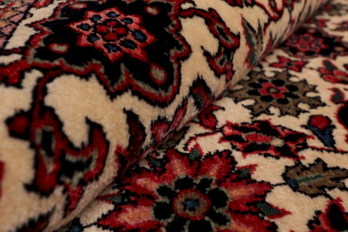 Bidjar is a small city in the heart of the Persian province of Kurdistan at about 200 km from Hamadan. The carpet production extends towards neighboring villages. Even though one of the features of knotting on a woolen warp is the fluffy feeling, these Bidjars are heavy and hardwearing. This is because while knotting these carpets, the weavers constantly beat the row of knots with a heavy metal comb.