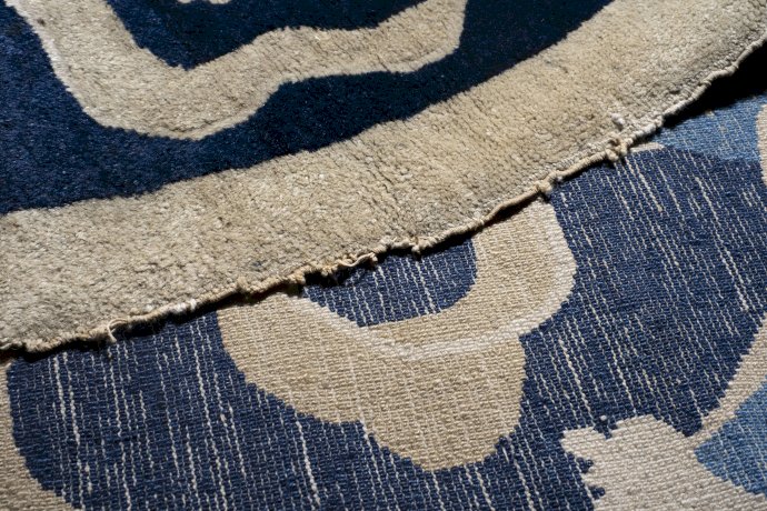 En comparaison avec l’Asie centrale et la Perse l’art du tapis s’est développé relativement tard en Chine. C’est de la fin du 17ème ou début 18ème que datent les pièces importantes dont le décor se retrouve sur la porcelaine de cette époque. Une identification précise des villes d’origine est chose difficile si le chercheur ne dispose pas de documents. Contrairement à la Perse ou l’Empire Ottoman, et malgré l’étendue du territoire, la technique régulière et uniforme ne donne que peu de clés. De même qu’on n’y retrouve pas la variété et la complexité des tons et de motifs il est clair que c’est un art qui a été régi par des règles ou des recommandations précises.