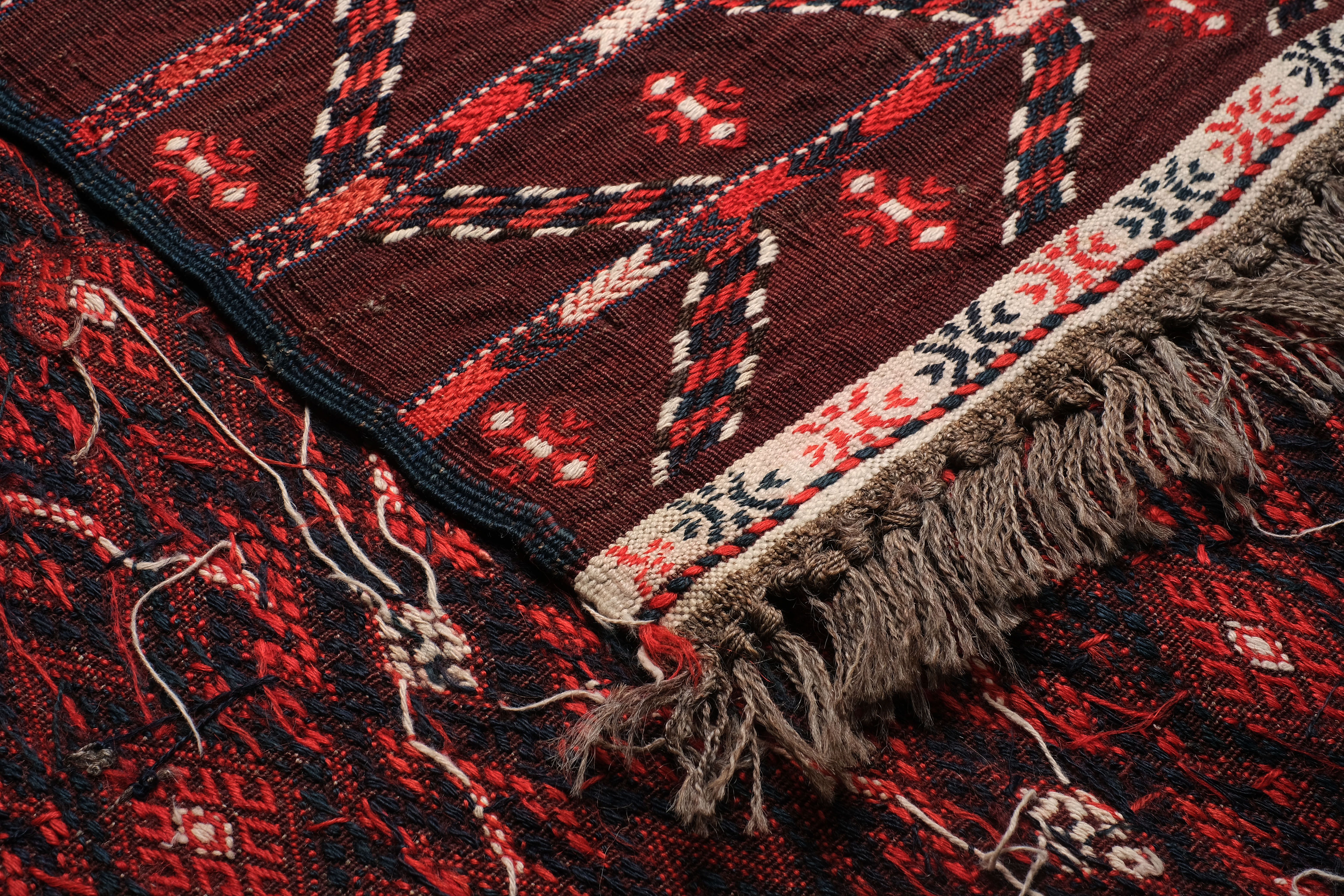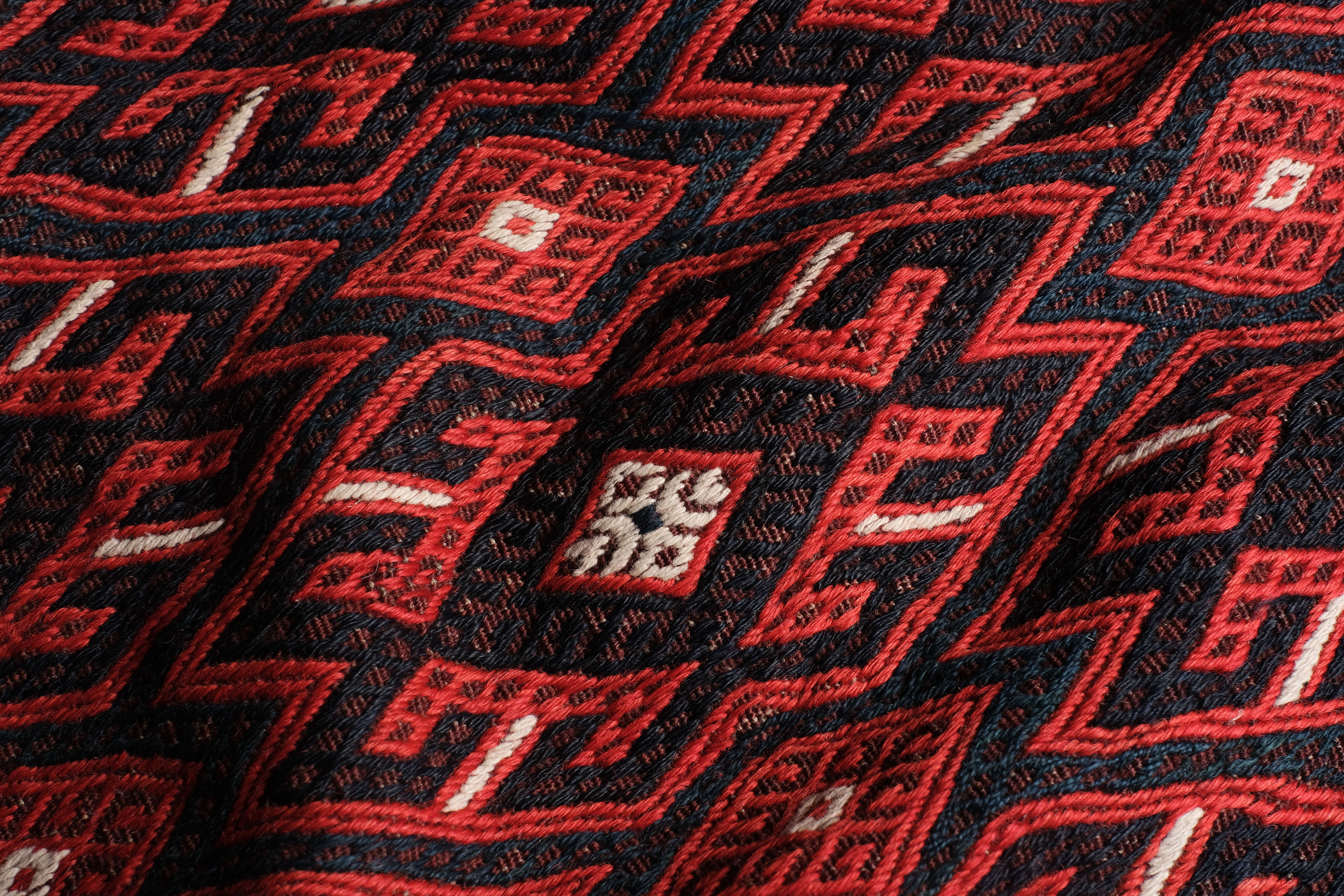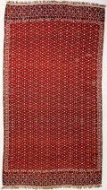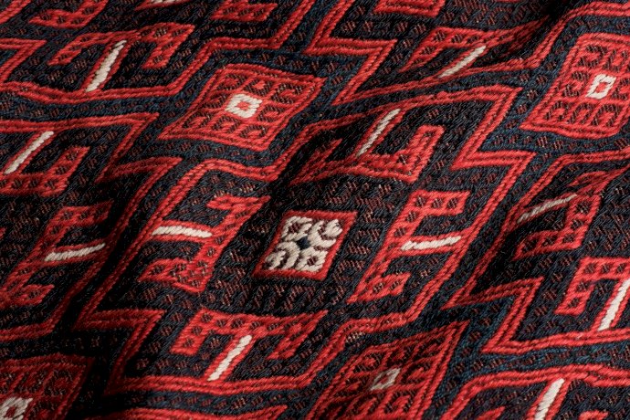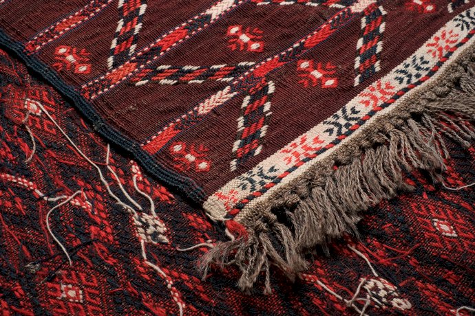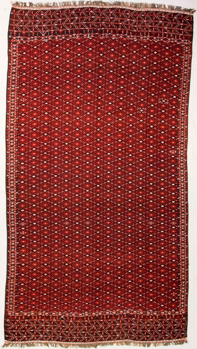 Weavers in Khorassan produce different types of carpets, as population is composed by Baluchi, Kurds and Turkoman. The latter (mostly Yomud) wove large sized, long and rather narrow pieces. The small, regular pattern obtained with the sumakh technique, reflects their common roots with other Turkmen tribes.