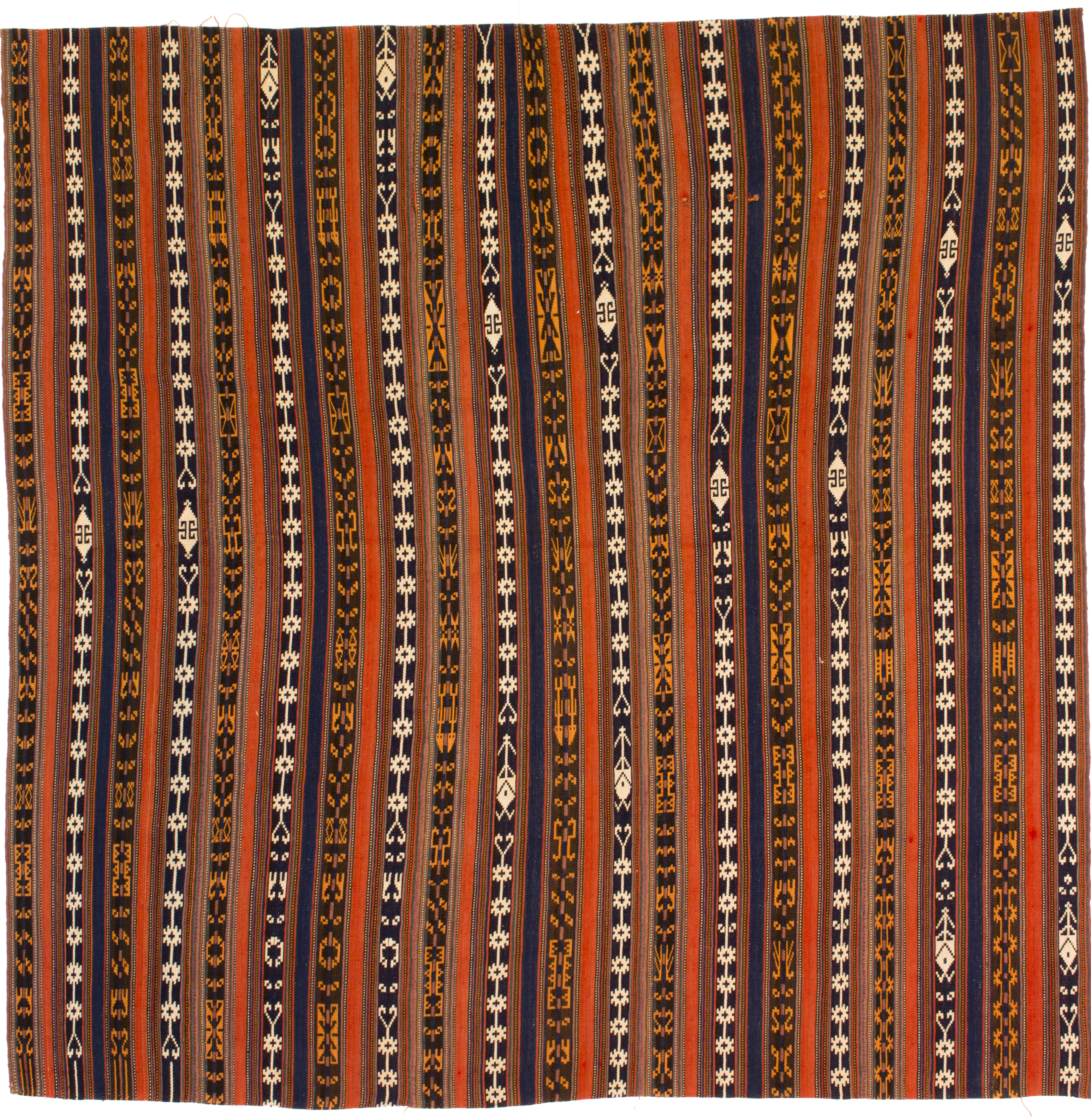The simplest jajim shows very plain stripes, some wider than others, in plain colours. The weaver has chosen these colours by putting his warps on the loom. The less numerous wefts are invisible.