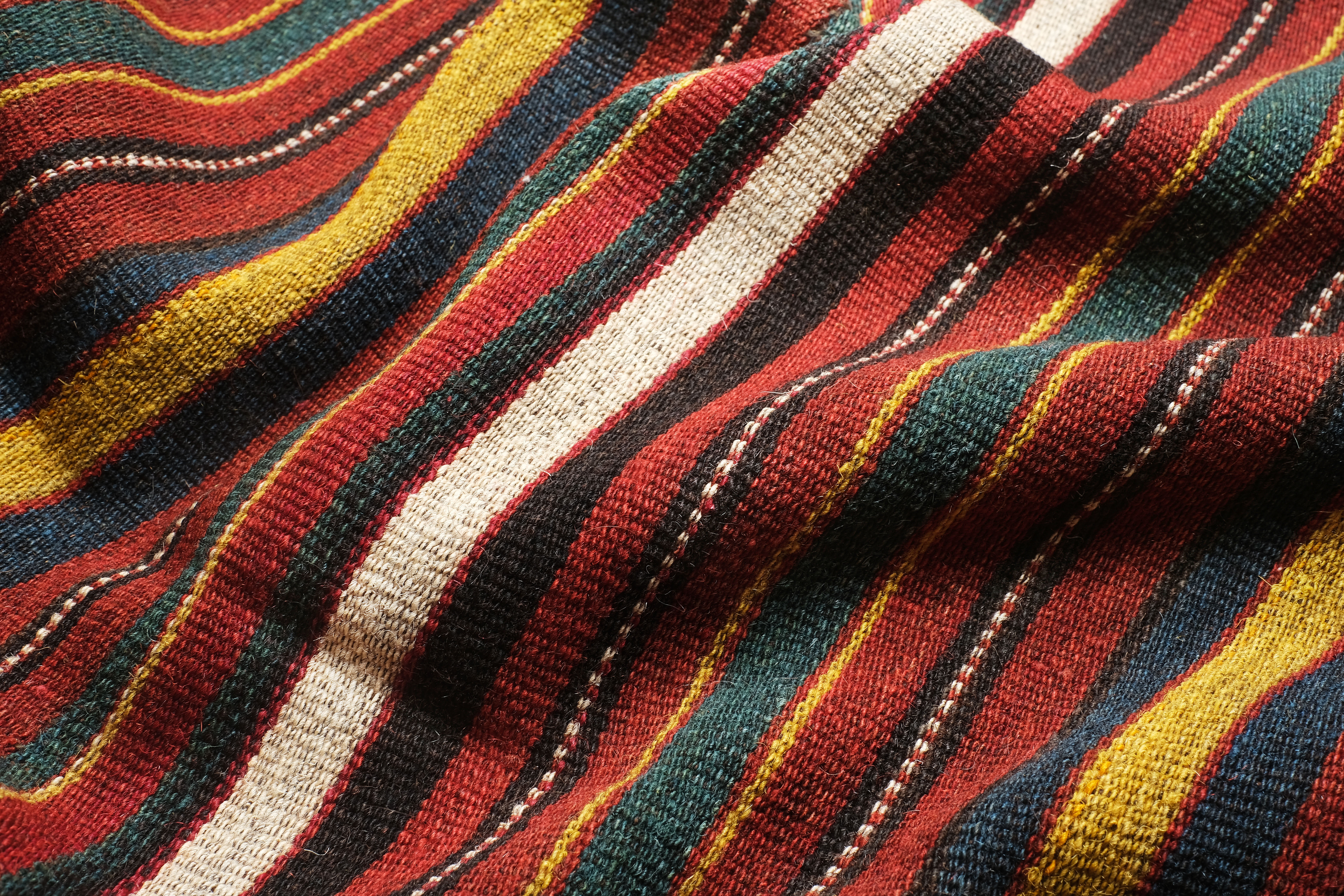 The simplest jajim shows very plain stripes, some wider than others, in plain colours. The weaver has chosen these colours by putting his warps on the loom. The less numerous wefts are invisible.