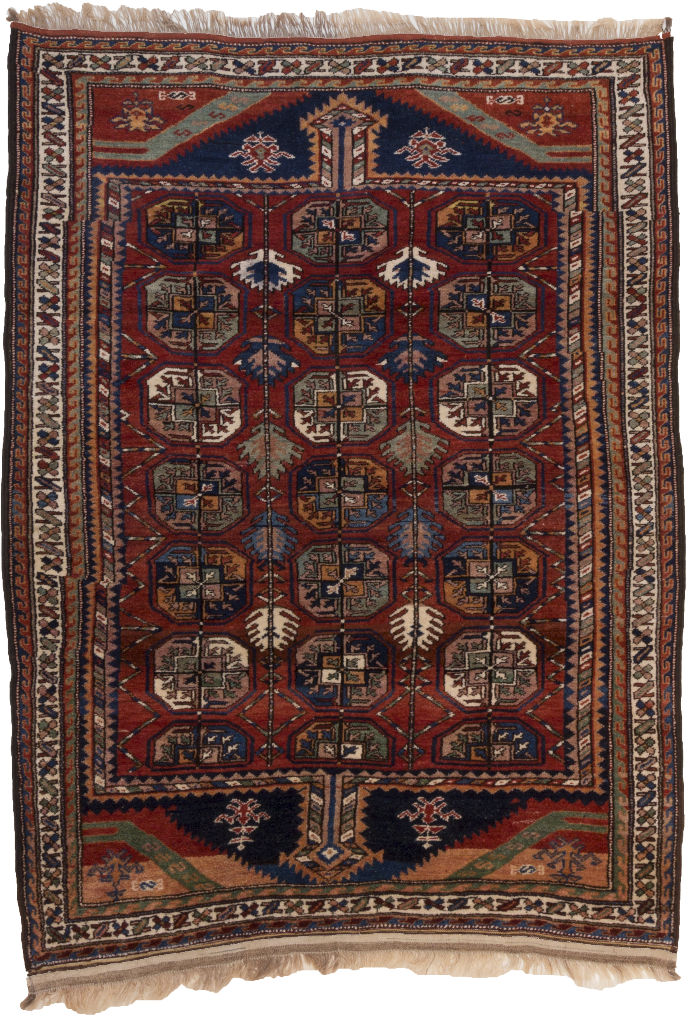 But in addition to this border region, the Kurdish population can be found in various enclaves in the four corners of the country (Veramine, Qazvin, Kermanshah etc). Those from the Quchan region (Khorasan province) are distinguished by their rich and varied production of small pieces in shimmering colours, reminiscent of Caucasian carpets in their geometry and freshness of tone. This is at least the case for the older pieces, as the more recently produced carpets have clearly been influenced by the Turkomans.