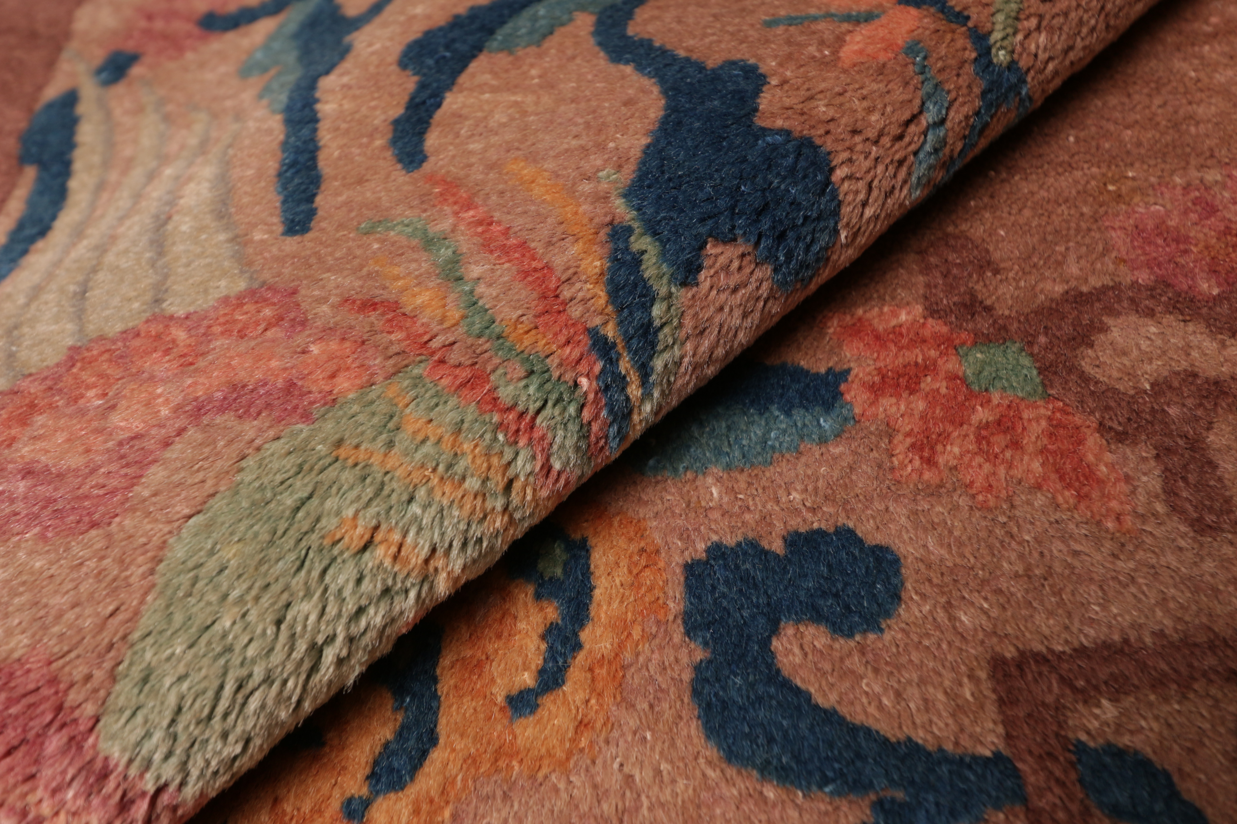 En comparaison avec l’Asie centrale et la Perse l’art du tapis s’est développé relativement tard en Chine. C’est de la fin du 17ème ou début 18ème que datent les pièces importantes dont le décor se retrouve sur la porcelaine de cette époque. Une identification précise des villes d’origine est chose difficile si le chercheur ne dispose pas de documents. Contrairement à la Perse ou l’Empire Ottoman, et malgré l’étendue du territoire, la technique régulière et uniforme ne donne que peu de clés. De même qu’on n’y retrouve pas la variété et la complexité des tons et de motifs il est clair que c’est un art qui a été régi par des règles ou des recommandations précises.