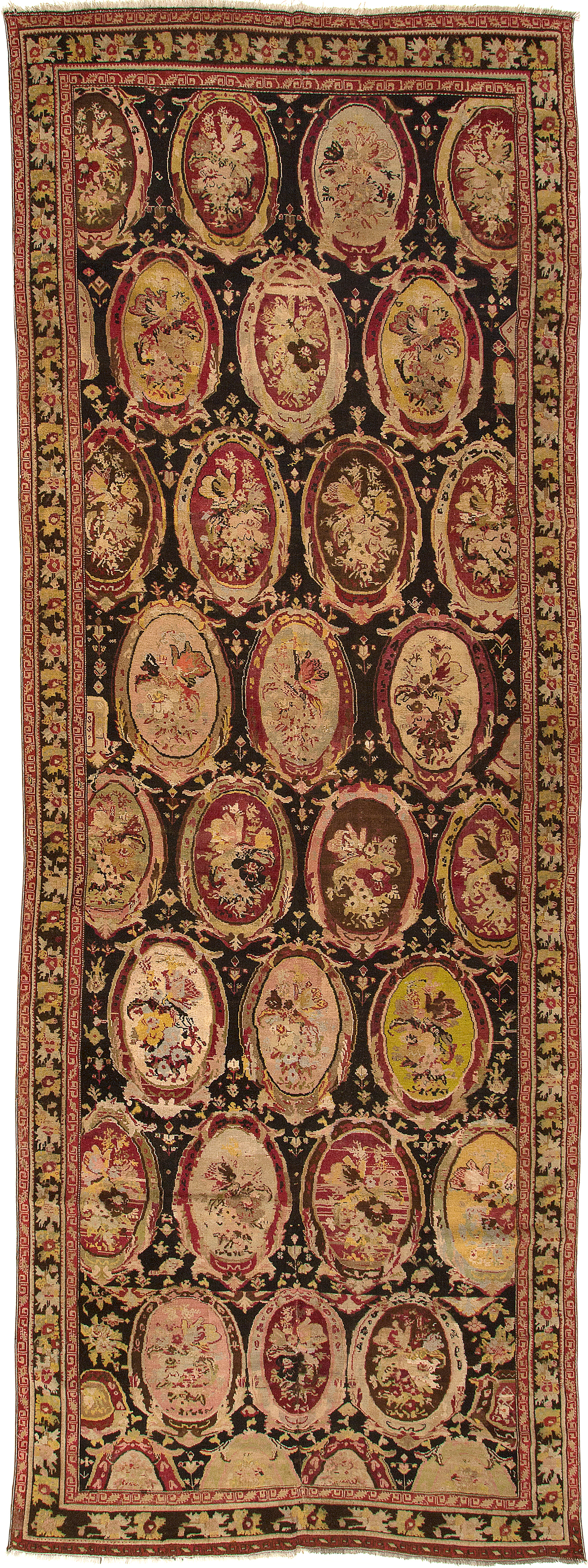 Après l’extension de la colonisation du 19ème siècle dans la région, il y avait une forte influence Européenne. Mais la population arménienne des villages du Karabagh traitait un nombre impressionnant de thèmes : des portraits humains (scènes historiques) ou tableaux animaliers (paons, chevaux, chiens, cerfs, etc), voire des cartes postales venues de tous les coins du monde. Malgré une densité de nœuds peu serrée, les artisans habiles surent transposer avec talent tout ce qui leur tombait sous la main.