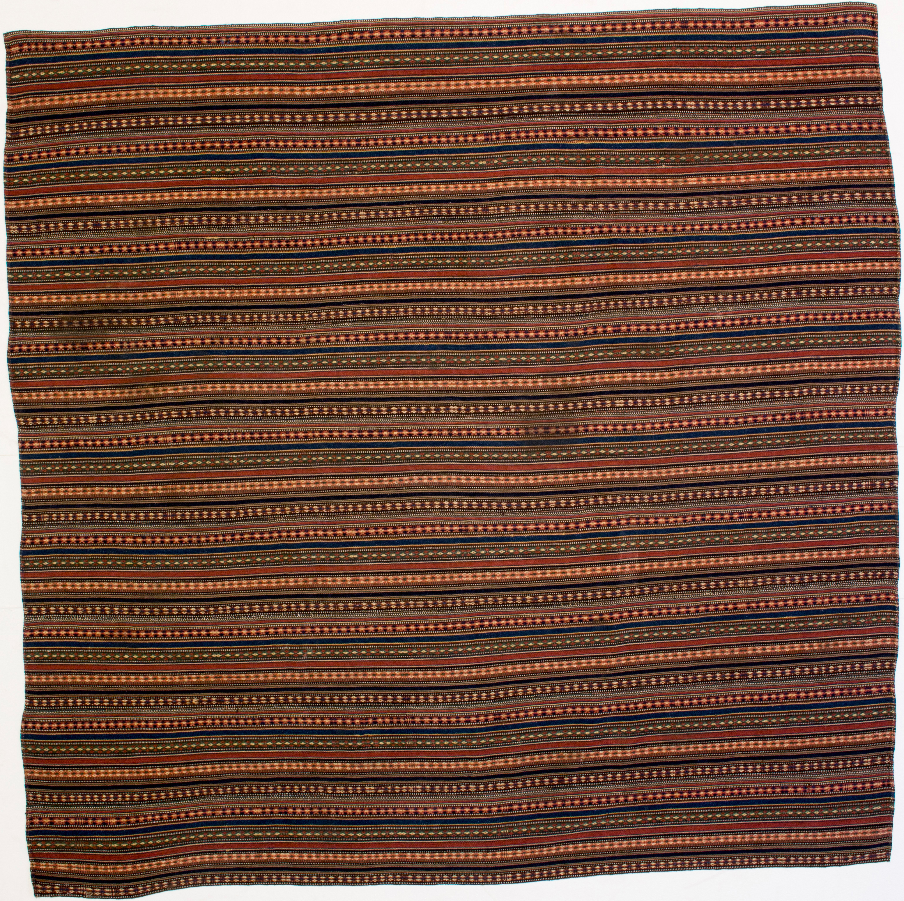 Les jajim les plus élémentaires présentent donc de simples lignes, plus ou moins larges, de couleur unie. Le tisserand a fait le choix de ces tons en plaçant les fils de la chaîne sur son métier. Les fils de la trame, moins nombreux, ne sont pas visibles.