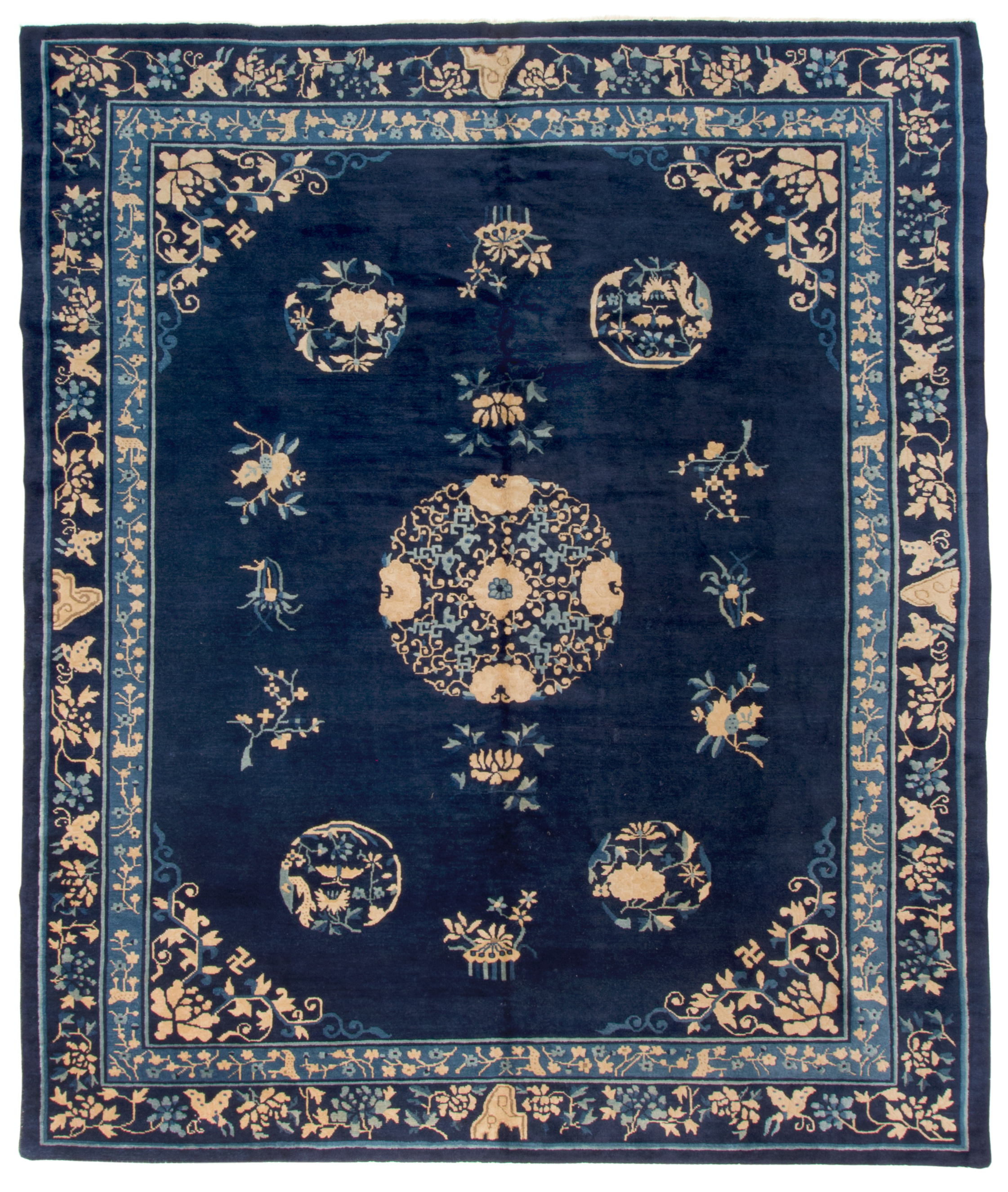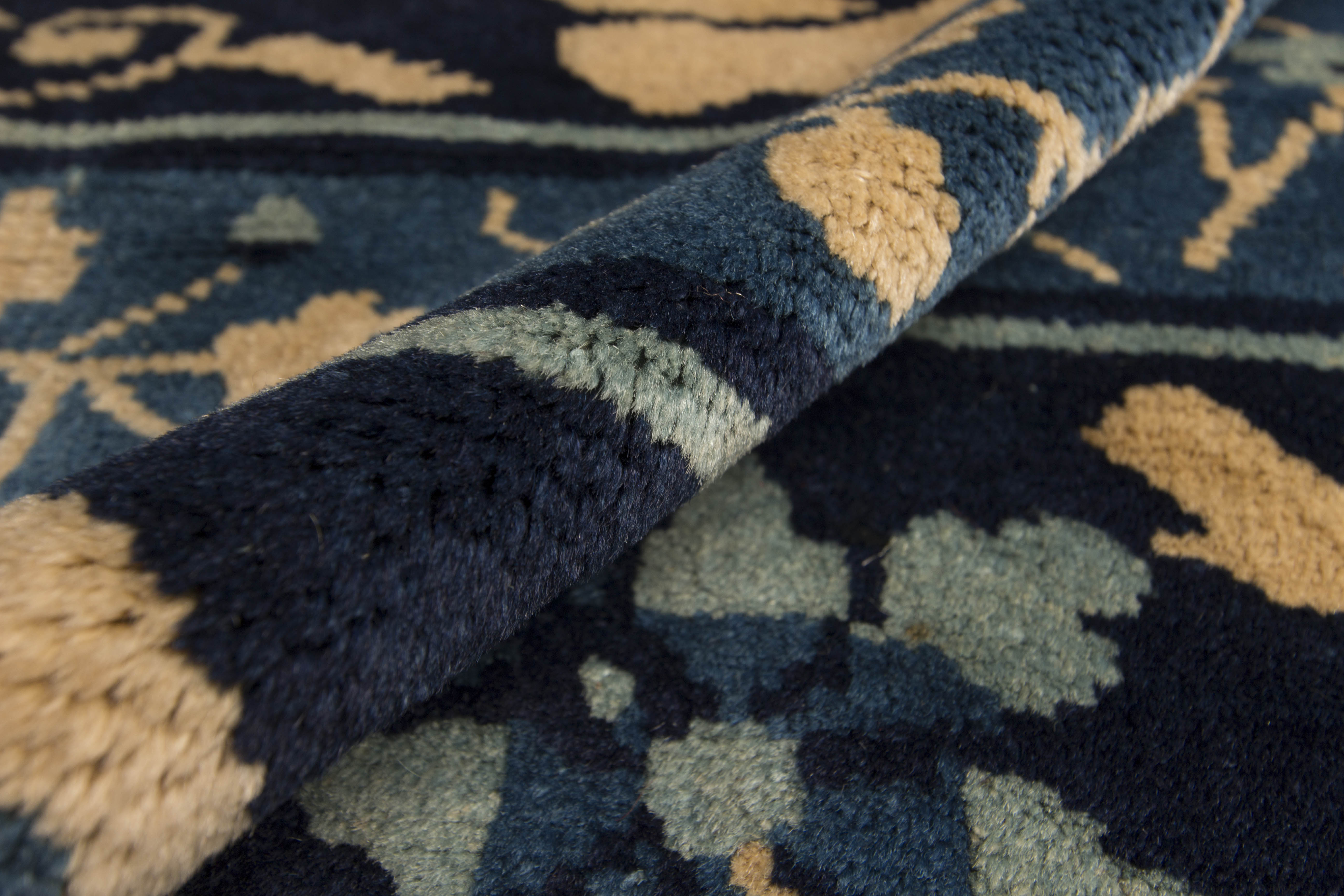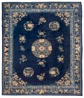 En comparaison avec l’Asie centrale et la Perse l’art du tapis s’est développé relativement tard en Chine. C’est de la fin du 17ème ou début 18ème que datent les pièces importantes dont le décor se retrouve sur la porcelaine de cette époque. Une identification précise des villes d’origine est chose difficile si le chercheur ne dispose pas de documents. Contrairement à la Perse ou l’Empire Ottoman, et malgré l’étendue du territoire, la technique régulière et uniforme ne donne que peu de clés. De même qu’on n’y retrouve pas la variété et la complexité des tons et de motifs il est clair que c’est un art qui a été régi par des règles ou des recommandations précises.