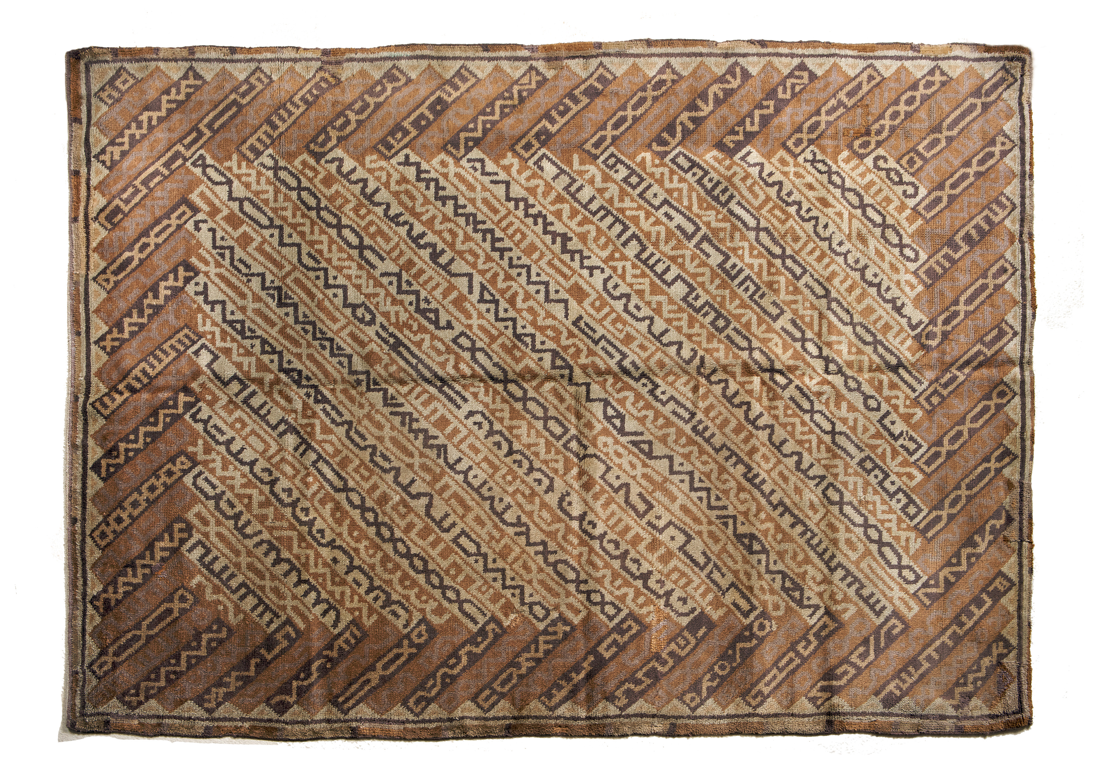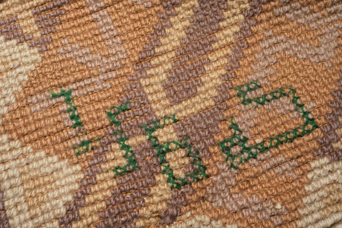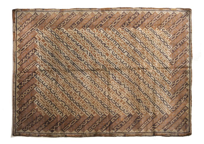 Handgeknoopt tapijt naar een ontwerp van Paul Haesaerts uitgevoerd in ateliers De Saedeleer. Op de achterkant zijn de nummering 1/6 en het monogram dS aangebracht met een kruissteek.